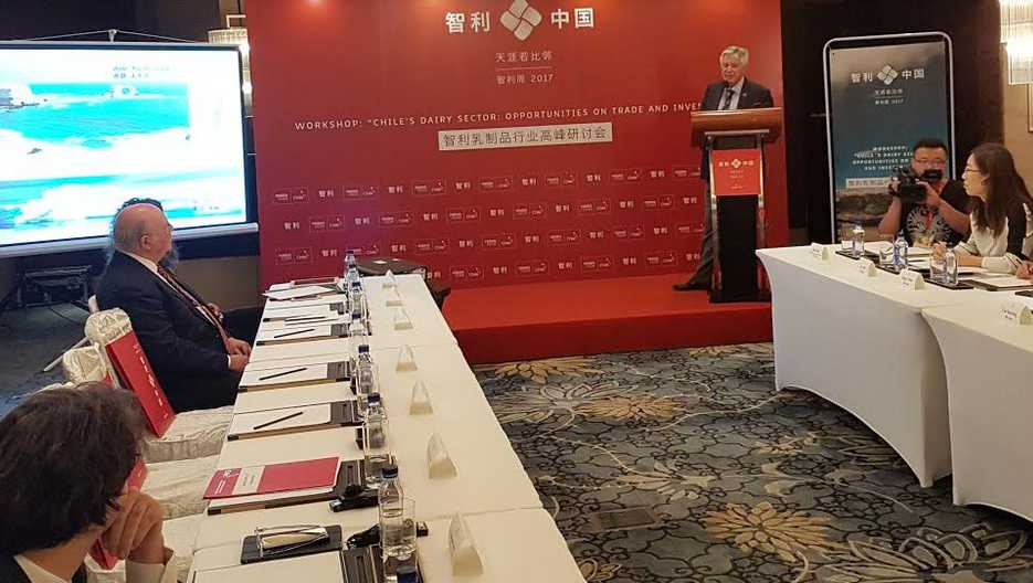 Beijing, 29 agosto 2017. Con un video de tres minutos que resume las potencialidades de la producción de leche en la Región de Los Lagos y exposiciones del subsecretario de Agricultura, Claudio Ternicier, y el presidente de Fedeleche, Rodrigo Lavín, que muestran las posibilidades de inversión que brinda el territorio en esta materia, se inició esta semana, en Beijing, un fuerte trabajo para fortalecer las negociaciones locales con inversionistas chinos. La actividad que se inserta en una nueva versión de Chile Week China, es parte de las actividades lideradas por la Seremía de Agricultura de Los Lagos con apoyo del ex presidente Eduardo Frei Ruiz-Tagle, actual embajador en Misión Especial para el Asia Pacífico.